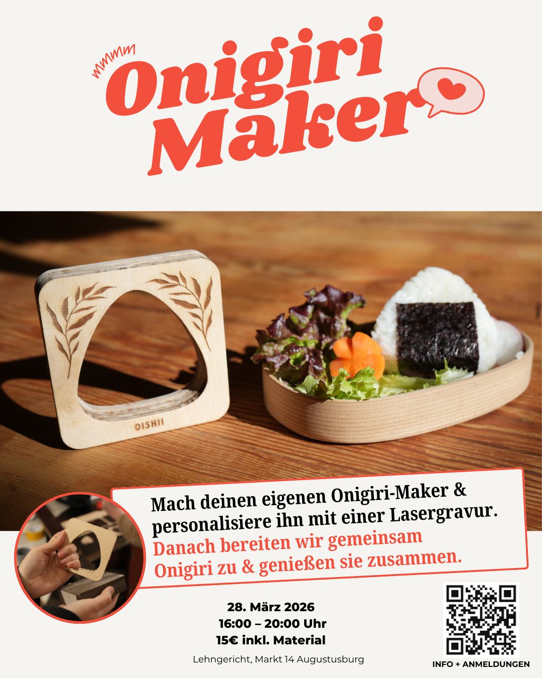 A workshop with Paula Meier at auf weiter flur, a maker space in Augustusburg on 28 March 2026. In the workshop, we made Onigiri Maker with a CNC and a laser cutter, and Onigiri together.